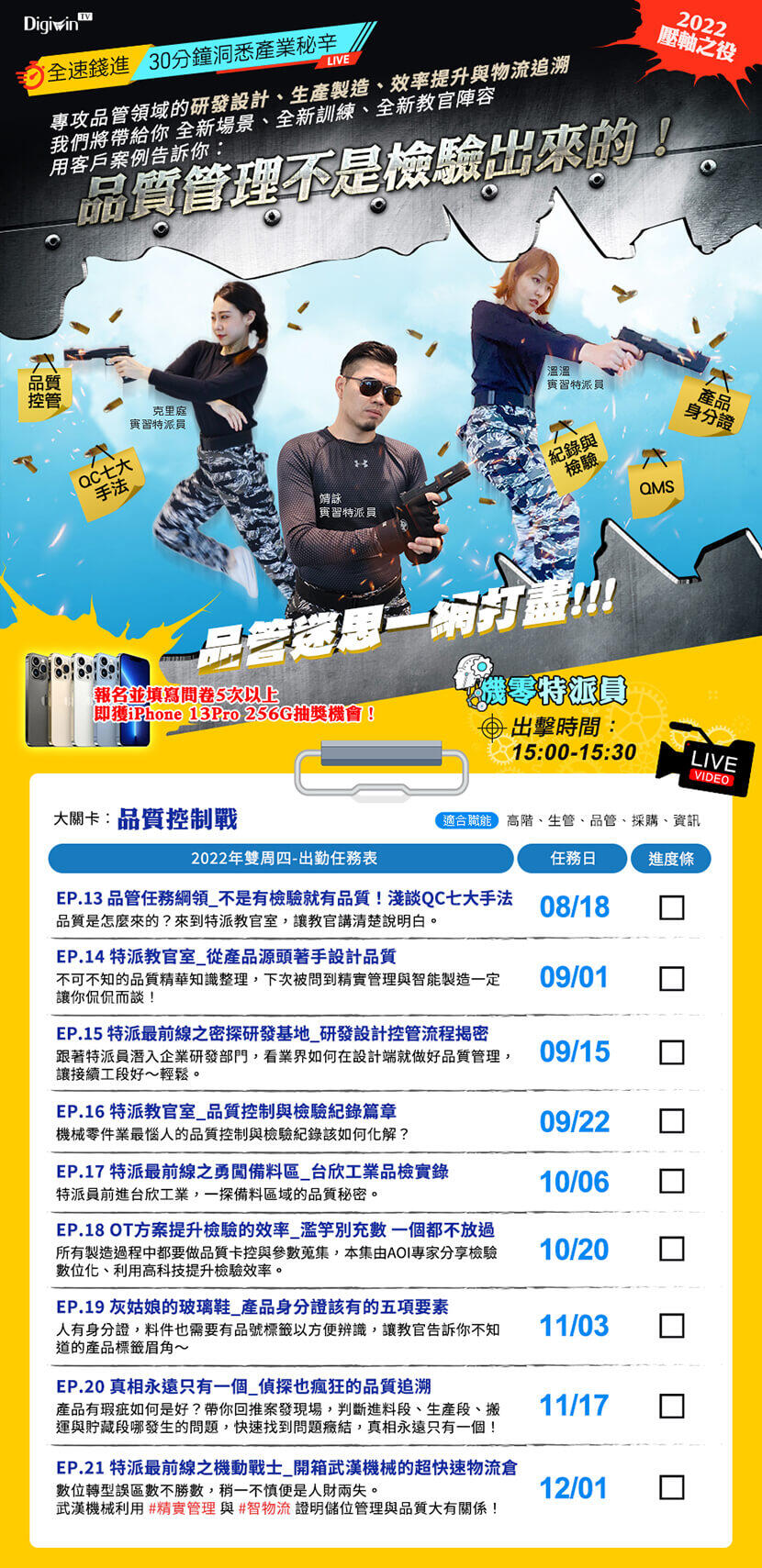 2023-09-21 【機零補給站】 EP.14 研發人員看過來,圖庫爆了怎麼辦? 2023-10-05 【機零出任務】 EP.15家住海邊管理法_圖文管好管滿的成功人士這樣做! 2023-10-19 【機零補給站】EP.16 掌握現場進度,從掌握機台一整天的作息開始 2023-11-02 【機零補給站】 EP.17 傳統排程派工要點與困擾 2023-11-16 【機零出任務】 EP.18 生管的一天feat. 2023-12-14 【機零補給站】 EP.19 排程派工再碳究竟 2023-12-28 【再碳究竟】 EP.20 品管再碳究竟