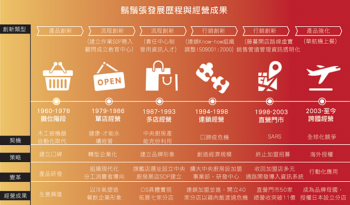 從單店走向多店的經營,張董事長有著先見之明,1990年透過顧問公司的建議導入資訊化,鬍鬚張在產、銷、人、發、財的管理制度,都朝向現代化發展,正式進入到多店經營時期。更以銷售帶動生產的創新促進了中央廚房的建立,引進了機器設備來代替人工由於投資成本非常沈重,直營門市的擴展及報酬較緩慢,才會有開放加盟的想法出現,讓分店衝出業績營收,讓店數分攤中央廚房產能,因而成立加盟連鎖事業部,編制連鎖管理規章。