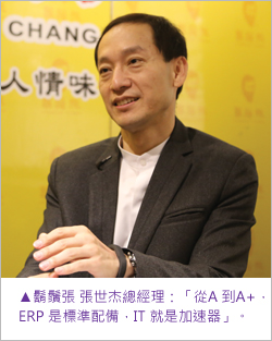 當鬍鬚張的組織愈來愈大,完整的系統架構可以完整的支撐營運的需求,有賴於作業標準書及ISO的導入,在說、寫、做一致的規範下,將作業流程與電子表單完整的結合,以ERP系統取代重複性的日常性工作,將人力發揮在更有價值的項目之上。