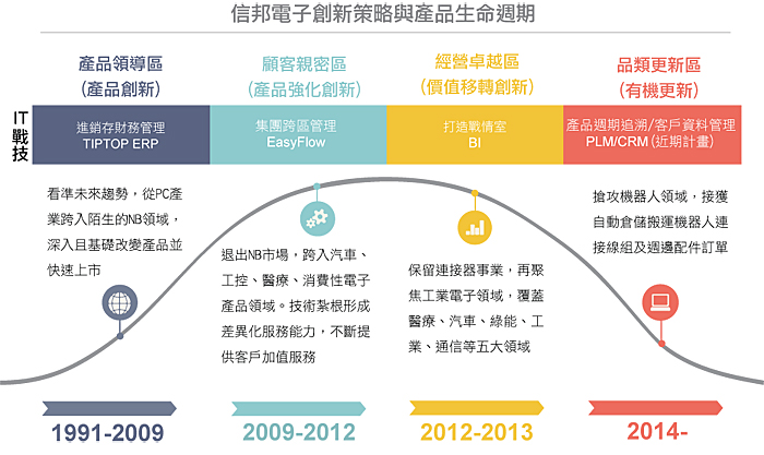 全球高科技策略大師─傑佛瑞.摩爾(Geoffrey Moore)於《企業達爾文》一書中提到:「成功企業面對最大陷阱就是被過去成功綁架,成熟公司一定會碰到成長極限嗎?」膽大心細的信邦,在對的時間做對的事,將創新策略與產品生命週期完美結合,快速準確地鎖定市場,追求逐步穩定成長。除了核心事業,也將資源分配至研發新領域,藉此提升公司力,拉到新的軌道,爭取公司最佳利潤。這更是為什麼客戶離不開,指定服務的原因之一。
