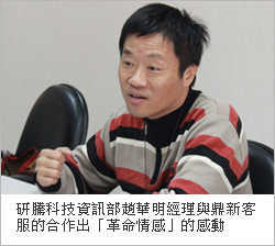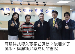 研騰資訊部趙華明經理激動地說:「當時最感動的是7月1日就要上線,在6月30日需要先開賬,晚上10點時盤點的檔案資料出現了問題,我就試著打電話給鼎新客服,結果客服佳蒨很耐心的一直陪我到12點,順利完成。因為不可能告訴使用者晚一天上線,所以對鼎新的服務團隊很感激,讓我渡過難關,有一點革命情感的感動。」在共同努力之下,使用者通過鼎新顧問耐心的指導和e-service學習,逐步踏上使用系統的正軌。