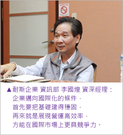 隨著公司規模逐漸擴大,IT的腳步勢必為拓展兩岸三地企業營運版圖的根基,身為耐斯企業資源IT規劃已達十多年的資訊部經理,李國煌(以下簡稱 李經理),一路走來妥善地規劃,為耐斯奠定了扎實的企業E化基礎。但當今科技變化迅速,眼看耐斯朝國際化邁進的目標日漸明朗,李經理看到了轉變的時機,為集團擘劃出下一世代的E化藍圖。