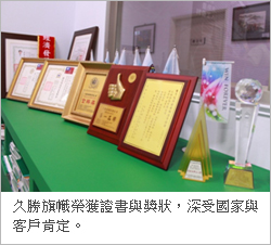 踏進接待室印入眼簾的是琳瑯滿目的專利、證書與獎狀。久勝旗幟98年獲得「國家優良商品金牌獎」,同年通過中華民國消費者協會評鑑,榮獲「第一品牌」證書及獎牌;99年獲得中華民國國家企業力發展協會「第七屆國家品牌玉山獎」,並於建國百年榮獲「年度十大企業 金炬獎」,10月受副總統蕭萬長邀請參加「建國百年--台灣經濟發展傑出貢獻」甄選活動深獲肯定,並由副總統親自頒發獎狀。