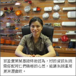 透過V-Point EIS主管資訊系統,使得管理者在因應全球景氣的變化;清楚了解目前產品銷售在各國的比重;可快速調整經營的方針。百盈實業特助葉惠綾小姐還表示,擁有的好的資訊系統仍須加強同仁們積極的心思,化被動為主動使得這套資訊系統能運用的更淋瀝盡致。