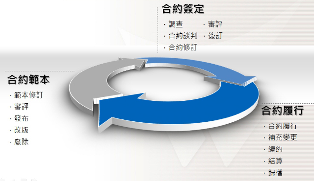 合約的生命週期依序循環如下:1.合約範本-範本修訂、審評、發布、改版。2.合約簽定-調查、合約談判、合約修訂、審評、修訂、簽定。 3.合約履行-合約履行、補充變更、續約、結算、歸檔。