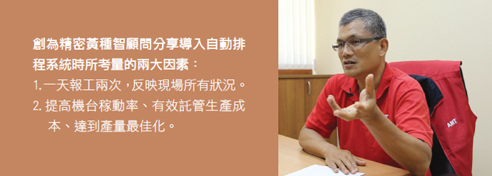 黃種智認為現在自動排程一天報工兩次,能反映現場所有的狀況;結合全公司的生產作業流程,順利上線提高機台稼動率、生產成本更有效託管以及達到產量最佳化,是最重要的成功例證。