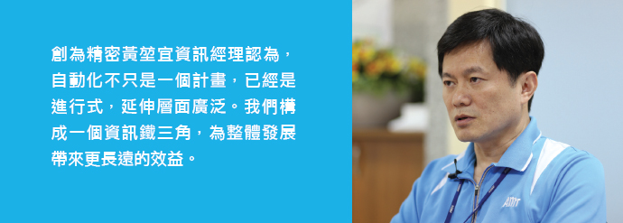 呼應政府計畫,創為精密期望從自動化做起,提高生產率。 儘管良率控制得宜,但總希望繼續精益求精。「人為作業、人力管制總會達到一個極限,若能結合管理資訊化、設備自動化,提高設備精密度、即時分析大數據,就能再突破良率的檢測限制,這是另外一個發展重點。」黃種智以堅定的眼神表示。