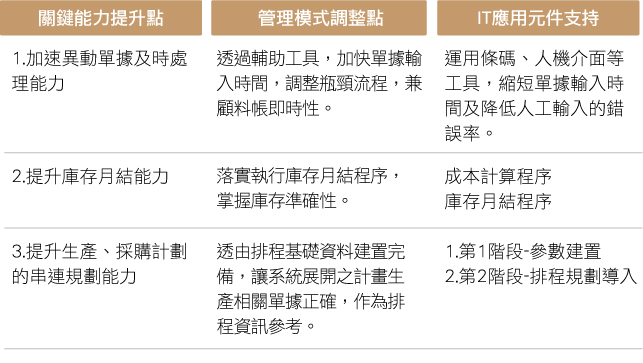 提高庫存即時掌控的能力,提供相關單位人員正確資訊的參考。 成本系統的導入,提升庫存月結的能力,加快帳務結轉的速度及資金運轉的能力。 |