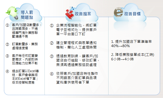 過去晴天美食剛起步時候,因為訂單數量不多,使用Excel檔案寄送也未發現任何問題;直到加盟店不斷的擴展,發現過去的作業方式已經無法負荷現在的業務量,如要消化這龐大的業務量,還得另外聘請新的業務併重新教育訓練,費時且傷成本。另外,在加盟店主端也常發生使用錯誤的Excel訂單版本下訂,後端工作人員因為Excel表單的謄寫、複製、貼上而導致金額或是商品數量出現嚴重錯誤,無形之間增加了龐大的企業成本。
