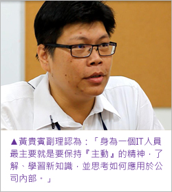 身為公司資訊化的推動者之一,黃副理也以過來人的身份無私分享資訊部門在整個專案中應當扮演的角色,黃副理說:「身為一個IT人員最主要就是要保持『主動』的精神,去了解、學習新知識,並思考如何應用於公司內部。當然,新技術必定價格不斐,採購與否在於老闆們成本上的考量,但告知產品優缺點,以及分析後續能否為公司產生效益,則是IT責無旁貸的責任。如果一個IT人員永遠在家裡等老闆、單位發出需求再去想辦法,那一定會『慢一步』,這樣的做法也只會讓IT部門永遠處於挨打的地位。」