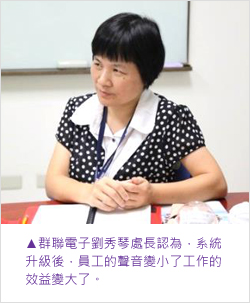 2009年開始導入鼎新TIPTOP GP,並加購BI商業智慧,其目的是為了能即時產出報表,讓企業能精準的掌握庫存了解損益。對電子製造業來說,ERP的整合性以及應用上的彈性是很重要的。群聯一路從鼎新WorkflowERP GP升級到鼎新TIPTOP GP,因兩套系統架構相同,故人員在系統轉換上沒有操作適應的問題,省去可能面臨的磨合期與適應期。本次接受專訪的群聯電子劉秀琴行政處長以及張淵富資訊副理表示,當原有的資訊系統建置速度趕不上企業倍數成長的腳步,則資訊系統的升級則勢在必行!