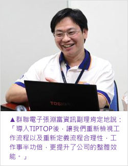 ▲顧問適時、專業的建議及指導,讓TIPTOP發揮最大應用價值,順利上線;多語言、多幣別與多據點的管理設計,提供群聯「集中」與「整合」管理的需求,有助於在大陸、日本、馬來西亞等地的擴張佈局。 ─群聯 劉秀琴處長