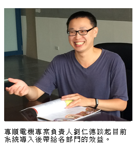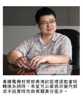 「換系統對我們來講就是一個契機」專順電機財務部康鴻欽經理(以下簡稱 康經理)於訪談之初就提起換系統對他們而言代表的涵義。尚未換系統前,專順電機(以下簡稱專順)面臨到成本無法結算、庫存掌握度不足以及大陸同仁對於舊系統的不信任感。「也因為大陸同事都有用過鼎新ERP的經驗,鼎新ERP的輔導方法論(TIM),有方法有計劃有效率的執行令他們印象深刻;加上舊系統不是以集團架構模式來進行,跑集團內的交易時(多角貿易),每個集團內的法人就要各自輸入交易單據,就會少了一些合理的判斷,也容易出現資料錯誤。」專順電機資訊人員,也是此次專案負責人劉仁德先生(以下簡稱 仁德)談到舊系統帶來的不便利性。康經理也補充:「早期責任區分時,舊系統沒有區分這麼多,尤其財務會計後端這邊,常常變成要幫權責單位輸入、核對;但這應是權責單位負責的事項,後續才由財務單位做最後審核。現在,我們也是藉由這次的轉換系統的機會,重新調整內控架構。」