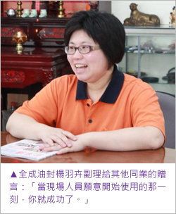 其實無論任何產業,系統導入過程中無可避免都會有一段磨合期。而全成油封是採取較柔和的作法,不給員工太大壓力,今天做到50%,就先以50%的基準進行調整,往後再陸續要求將準確率拉高,一點一點的讓員工與公司都更加進步。關於這段導入的心路歷程,楊副理感性地說:「一個系統能成功運作,一定是有許多人的付出,真的很感激所有內部、外部參與人員的配合,讓公司的系統直至目前為止運作都很順利。」