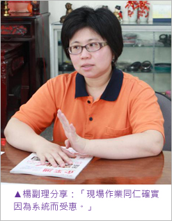 從前的人工作業階段,不僅會因為每個人字跡、用詞程度差異而產生誤值,此外,在製程上若需要增加額外步驟,就需用傳統方式手動翻閱報表才能了解目前狀況。導入系統最大的優點,除了減少了字跡辨識的錯誤率之外,資料記錄都較以往完整且清楚呈現。楊副理懇切地說:「非常謝謝鼎新顧問幫我們重新規劃品號編碼方式,現在即使客人突然地新增加工元素,只要現場人員去SFT查找,所有資訊馬上一目了然展現在眼前,我們的作業確實因為資訊系統而受惠!」