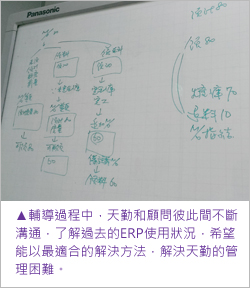 在輔導過程中,雙方透過不斷的溝通,了解過去的ERP運用狀況。由於舊系統導入已有相當長的時間,許多流程及做法已不可考,天勤進而自行衍生出許多解決方式,雖能夠達到想要的目的,卻徒增作業上的麻煩。例如:託外加工料件舊有運作方式於使用者而言,必須透過好幾個步驟才能完成。經由廠供料流程溝通引導下,使用者僅需以批次作業,由系統自動產生廠商加工料件之進貨單及領料單,減少手動開單的麻煩;同時也將BOM表修正為最原始易懂的狀態,大為減少使用者的時間,讓流程一氣呵成具有連貫性,更是取得研發及製造人員的大大認同。