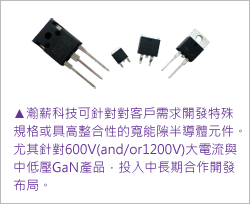 瀚薪科技2013年4月成立於新竹,是全台灣第一家供應寬能隙半導體解決方案技術的廠商,產品以碳化矽(SiC)、氮化鎵(GaN)之功率元件為主,具有高功率、耐高溫、高導熱係數等優異元件特徵,適合在高溫的惡劣環境操作,不但能縮減系統內配置的冷卻系統,更有助於應用系統達到小型輕量化的需求,如應用於車用變頻器中,可使車用馬達體積縮減50%,同時提高馬達驅動系統的效率與可靠性,對台灣高功率半導體元件發展具有領頭羊指標。