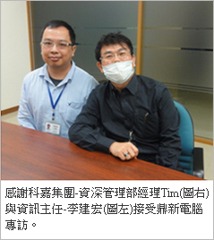 如同其他現代企業,資訊投資常為公司重大決策之一,因此在系統評估階段,Tim也是下足功夫面談國內外各家ERP軟體大廠,鼎新電腦也在評選名單之中。因現代企業資訊流程均貫穿公司內外,從個別部門到整個集團、從客戶端到供應商;從作業面、管理面到經營面,資訊架構都必須縝密推敲、仔細驗證,以求在系統導入前、中、後期皆能需符合公司需求,在此要求下,Tim說道:「業界口碑以及科嘉經營層過去使用過的良好經驗,使得鼎新脫穎而出,而TIPTOP ERP也成為科嘉跨集團更換資訊系統的首選。」