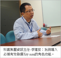 系統導入前期,鼎新顧問都會建議客戶在公司內部選定Key Man和Key User以利教育訓練的推展與品質,但多半客戶受限人力規劃,很難同時安排Key man和Key User兩個角色。Tim在了解各廠區人力狀況後,也依據現況將專案參與成員做了調整與規劃。科嘉的資訊主任,李建宏(MIS Supervisor,以下簡稱建宏)補充說:「有效的人力安排,讓系統推廣成效更顯著,表現較優秀的廠區Key Man,也因為角色的有效發揮,使得該廠區的系統導入狀況相對較佳。」