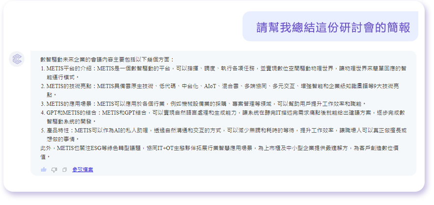 ChatFile是透過鼎新METIS平台的文件解析技術,所為企業建構的一個新型態的知識管理平台(KMS),結合了微軟OpenAI的GPT生成式AI模型,讓使用者(企業員工)可以利用對話的方式,從文件中快速找到解答。