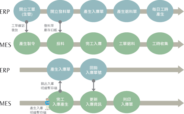 對於生產資訊的收集,並能整合自動化設備,建議納入MES控管,整個生產過程中透過 MES 與 ERP緊密串接資料,以達最佳應用。下圖為MES與ERP作業流示意圖