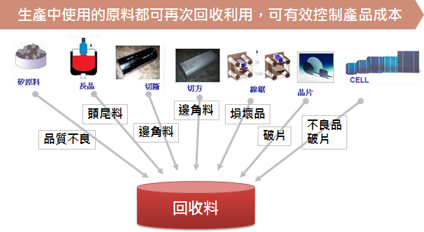 至於回收料,太陽能電池生產過程中,有許多的原料可以再利用(如下圖),可透過ERP系統記錄回收的料件與回收投入的用量,並於後續生產工單開立時自動帶出可回收料件與用量,可有效控制成本。