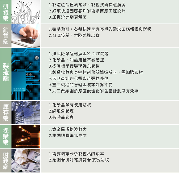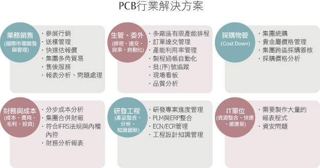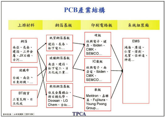 印刷電路板的產業關聯中,銅箔、樹脂、玻纖布是最上游的原料,藉由這些原料可生產出銅箔基板及玻纖膠片,最後產出印刷電路板。PCB主要可分為硬板、軟板、複合板等類型,其應用範圍極廣,包括民生用品的電子產品以及通訊、資訊、車輛、航空、船舶等相關科技產品。另外,BGA(IC載板)為IC封裝中第一層封裝用的載板,主要作用在於為晶片提供保護、支撐、散熱的通道,並形成標準安裝尺寸。
