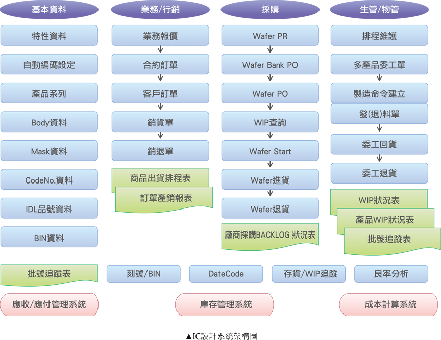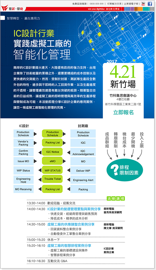 刻號/批號/Datecode/BIN管理,一直是IC設計業十分重要的管理議題,鼎新在IC設計產業超過150家的輔導經驗,提供的方案除了業界最重視的外包回貨與外包進度(WIP Status)、自動發委外工單,也提供企業更精準的成本分析,與各項銷售預測分析、專案管理,另外在虛擬工廠的即時管理與智慧排程方案,讓供應鏈整合更加即時與智慧。