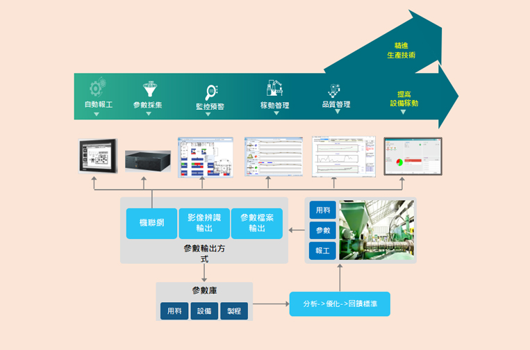 建置自動化生產參數採集機制是核心技術數位化的第一步,機台生產參數的彙集,除因應大型客戶之製造全履歷的需求外,並利用生產參數大數據統計分析,進行參數趨勢推論,進而演化出更佳標準生產參數,達到預測未來、預防不良產出,因此,如何充分建置參數採擷機制,利用生產參數數據,透由分析轉為生產知識庫,以提升生產效率及品質,乃是塑膠產業經營必須面臨的重要課題。