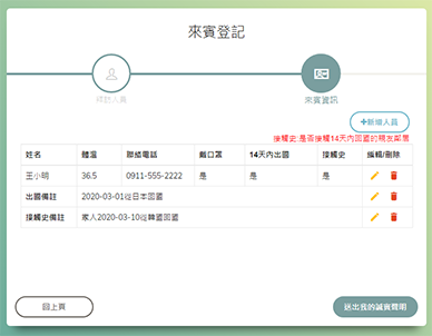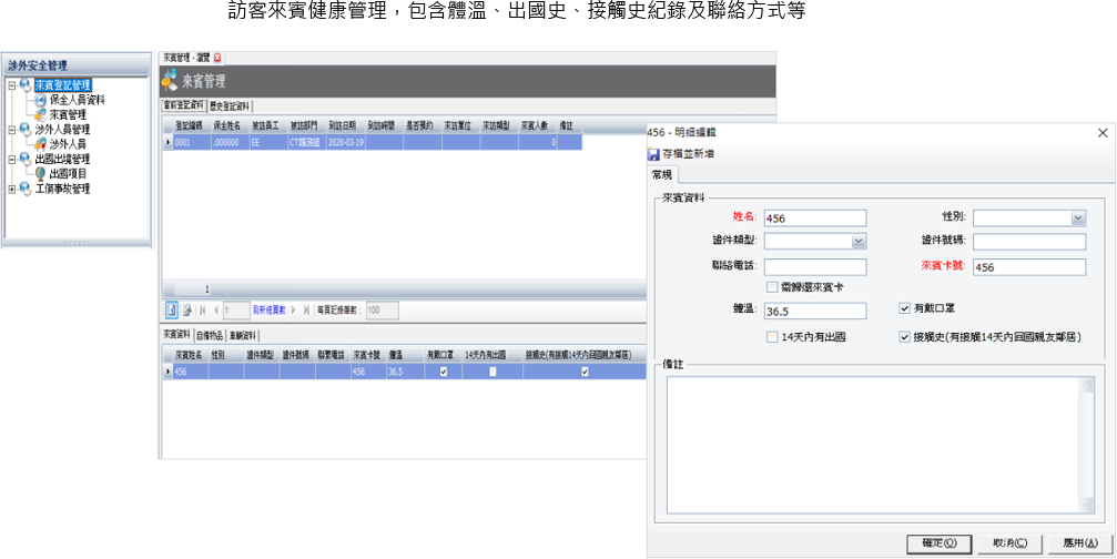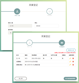 訪客來賓健康管理,包含體溫、出國史、接觸史紀錄及聯絡方式等