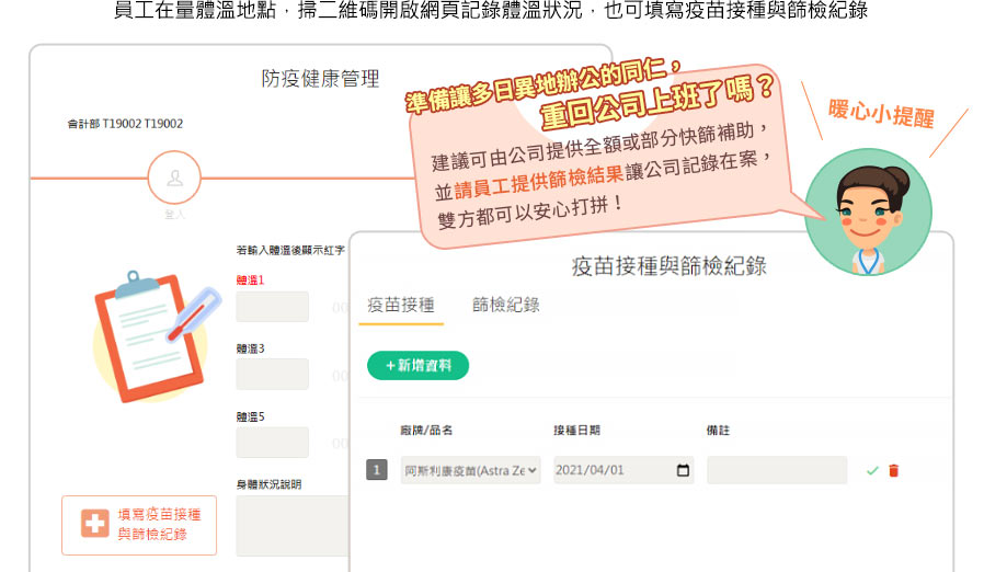 員工在量體溫地點,掃二維碼開啟網頁記錄體溫狀況,也可填寫疫苗接踵與篩檢紀錄