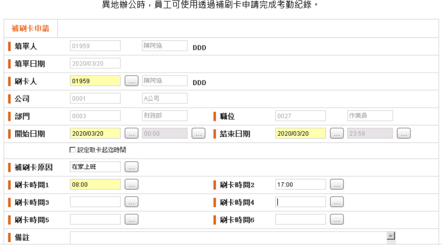 異地辦公時,員工可使用透過補刷卡申請完成考勤紀錄。