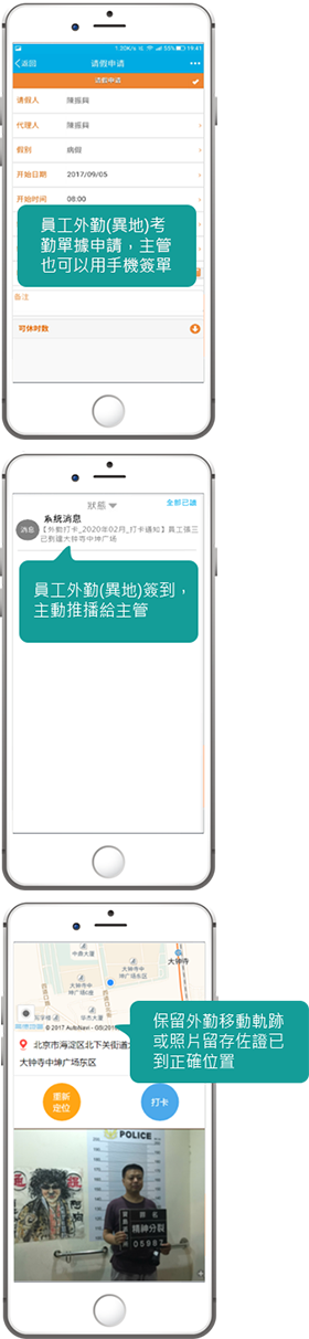 外勤(異地)工作員工,也可用 GPS 定位外勤簽到;還可紀錄外勤軌跡。