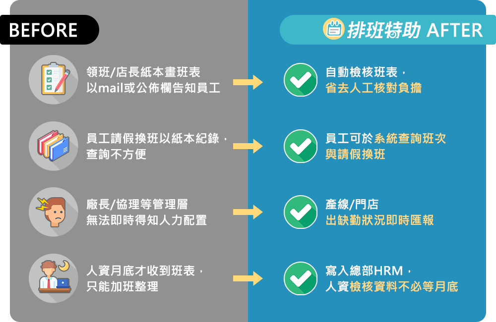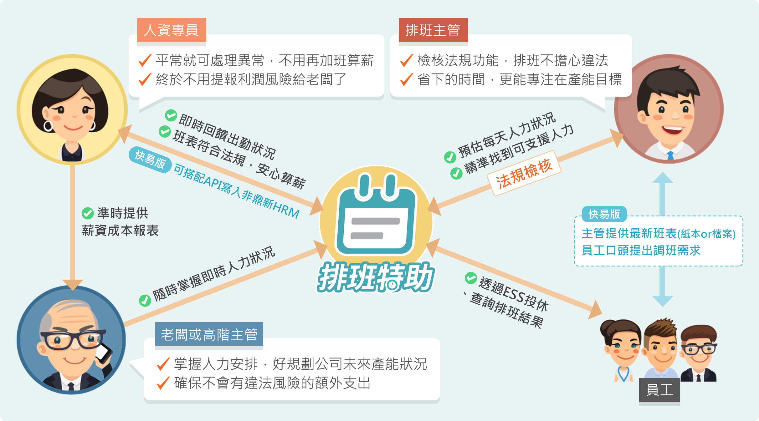 各產線能配合客戶要求快速調整班表,人資核對出缺勤只要30分鐘,計薪快狠準