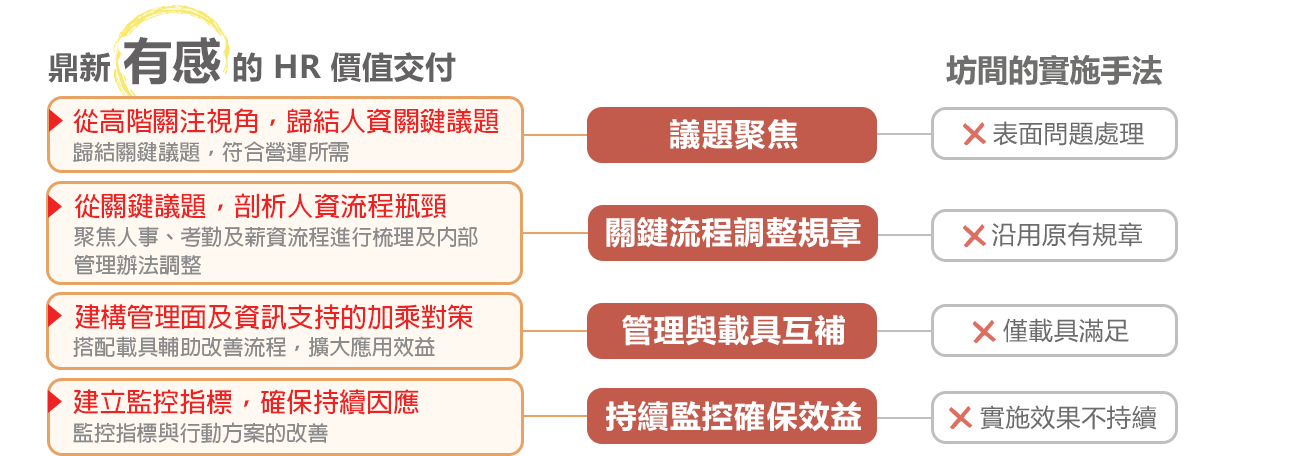以效益為導向的關鍵職能作業流程規劃,彈性因應市場不確定性與法令政策改變,提供對應的管理系統與諮詢服務。