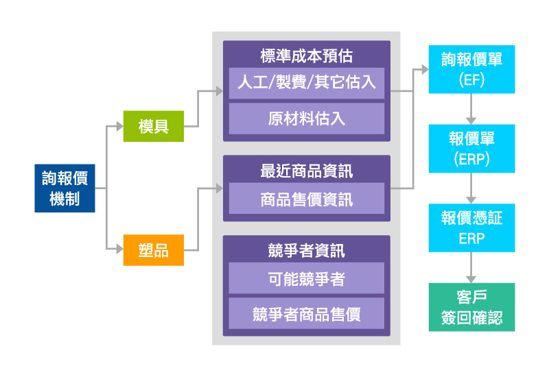 詢報價資訊統一管理,便能提升報價速度與正確性。同時面對市場變化作製程調整,同步更新報價成本結構,可提升訂單簽約率。把客戶詢報價成交統計及分析管理,還能提升客戶關係滿意度。