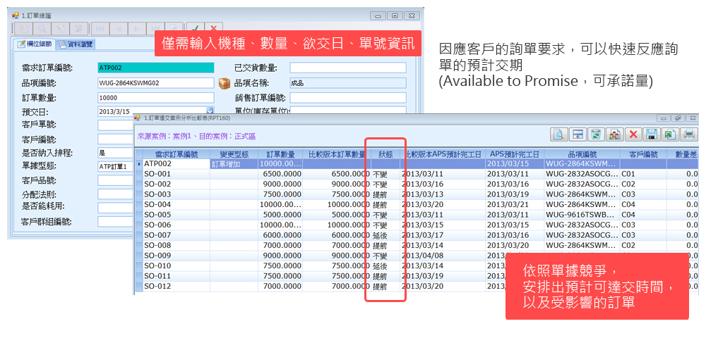 交期回覆、急插單、產銷協調在在考驗業務的能力!生產資訊不通透,客戶詢問交期時,需等生管逐一詢問現況才可估出交期,而使用Excel人工排程不好嗎?FCST與實際訂單的沖銷,人工搭配EXCEL方式計算耗時且無法精確計算哪些料會變成呆滯料,哪些料還需增加採購,更別說差抽單的影響了,因此提升生產排程規劃速度才是當務之急!