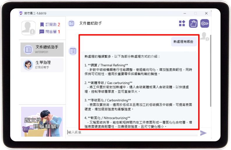 文件總結助手的生成式AI技術能快速精煉摘要,協助「知識封裝」。使用者可以在企業文件中尋找關鍵知識,像是新人可以輕鬆了解公司產品FAQ;生管人員能透過AI問答查找製程文件,快速解決突發的製程問題。