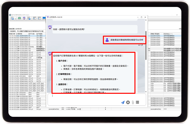 AI報表分析助手可依使用者或內建指示自動分析資料,進行高效彙總與多維度分析,強化決策支援與營運洞察。
