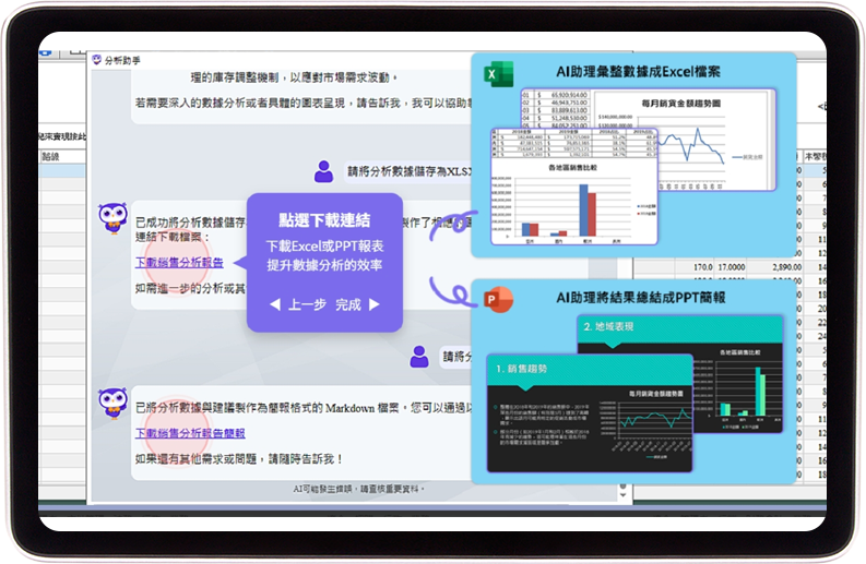 AI報表分析助手可依指定分析維度,自動生成對應圖表並彙整成報告格式,大幅提升數據解讀效率與報告製作速度,提升資料應用效益與決策敏捷性。