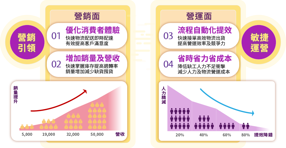 在買賣、零售、批發等流通行業中,任何需要進行商品儲存、運輸和配送的行業都需要高效儲運,運用系統自動化串接、設備工具支持場景應用,最後逐步邁向智慧化與智能化,將能更有效幫助企業提高效率、降低成本、增加營收和提昇品牌形象。