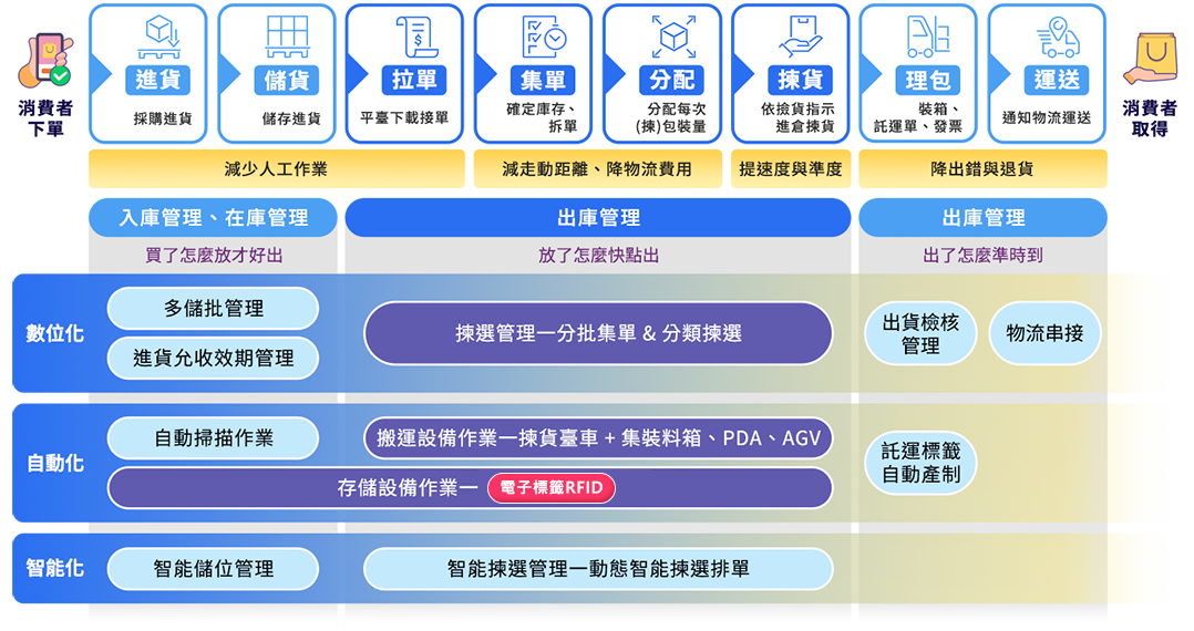 企業可以選擇數位化、自動化到智能化的儲運管理模式,從自動接單、自動化倉儲到智能儲運、智能揀理貨、