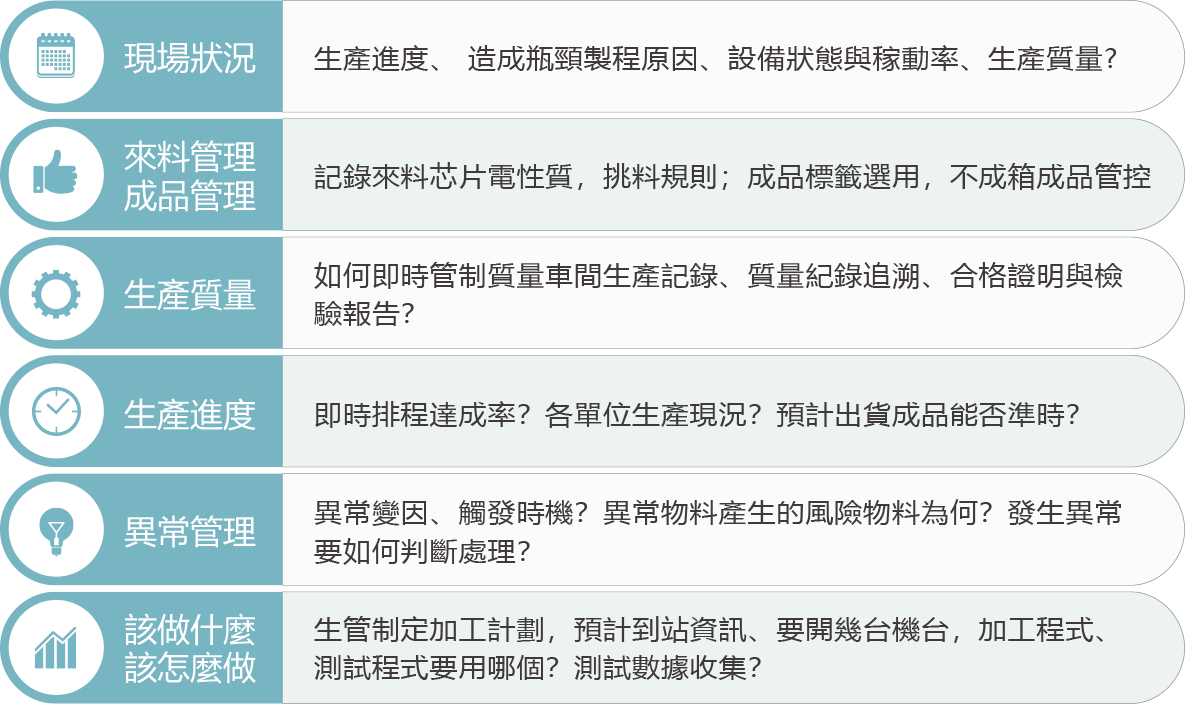 iMES系統針對半導體產業的矽片材料、外延、芯片製造、封裝與測試等製造供應鏈生產管理, 提供半導體矽片材料、外延片、芯片製造、流片、集成電路封裝測試、分立器件封測、 LED封裝測試、電子組 裝等產業完整的生產管理與系統導入,並以專業的顧問服務團隊、跨半導體上、中、下游的系統整合、實施經 驗及彈性的系統架構,與客戶共創管理效益、數據價值。有效提升工廠營運效率、縮短交期、降低成本、即時 生產管制、智能預警降低營運風險、提高產品質量,提升客戶滿意程度,並優化企業競爭能力,也是連結產及 其上、下游延伸產業與整合的基礎。