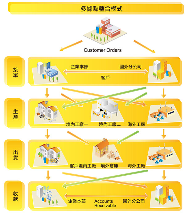 Workflow ERP GP系統提供更彈性的多語言架構,可切換繁體中文、簡體中文、英文以及越南文語系介面,另有自訂語系翻譯字詞功能,提供在地化使用者應用,因應各地特有法令進行系統調整產出報表:例如中國大陸加工貿易的管理、海關合同配合海關接口,並可直接從ERP中產出相關文件,協助減化各項進出口貨物流程。同時協助製造單位與生管單位在同一平台上,進行生產規劃及製程即時資訊掌控,並可透過條碼機制協助現場人員進行生產資訊申報,達到降低作業成本,提升人員效率,提高製造資訊正確性,建立快速有效的生產模式。