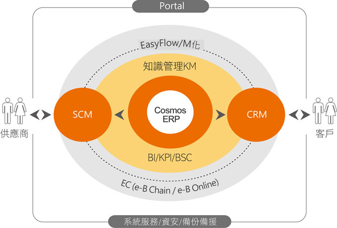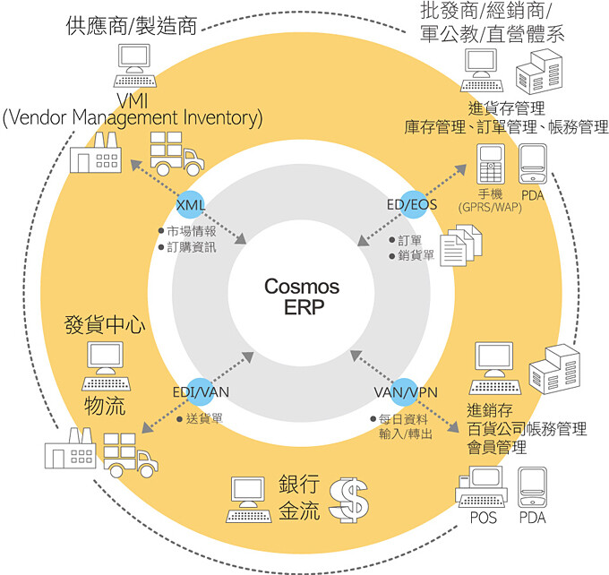 Cosmos ERP乃因應21世紀買賣流通業商務洪流―快速變動、無國界、微利所需的e化完整解決方案,整合流通經營體制,從上游加工廠商、國外供應、境外公司到各地分公司、物流中心,一直到下游通路,從ERP到ERPII滿足企業對資訊及管理的需求,高度整合企業內部流程,從客戶接單、存貨、採購、生產到發貨等ㄧ連串作業,提升企業內部資訊的溝通與管理效能;Cosmos ERP的生產管理相關系統完整的解決方案 , 是以快速回應和品質管控為導向, 提昇買賣流通業從產品結構 、製令託外、物料需求、製程、成本及品管保稅,一連串作業循環中資訊的整合與管理效能。