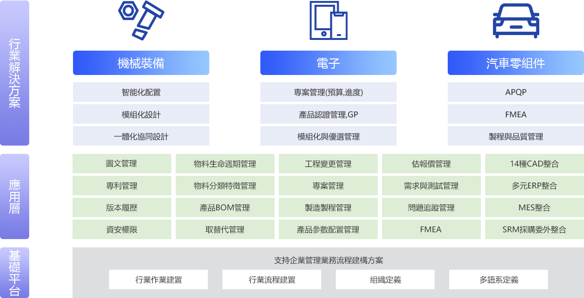 電子行業產品須符合不同國家法規與品質要求,自動化生產普及率高,產品功能常須包含光、機、電等多研發領域,設計過程複雜度高,新品研發週期長,同業競爭對手多,電子材料規格複雜,特徵屬性管控不易,產品研發到上市週期包含研發成本管控一直是企業關注的管理重點。