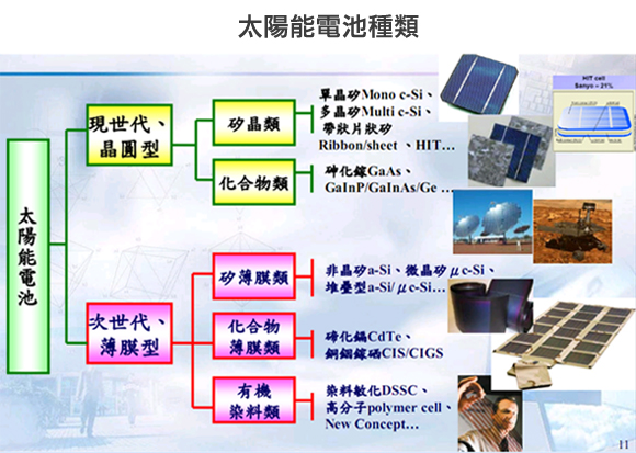太陽能電池最早應用於太空科技,近年來被廣泛的使用於地面發電系統及各項消費性產品。太陽能電池類型可歸納如下圖: